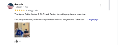 Thankyouu Dokter Sophia & SILC Lasik Center, for making my dreams come true. Dari pelayanan awal, tindakan sampai selesai terbantu banget sama Dokter dan staf-staf SILC Lasik Center yang informatif dan ramah. Bener-bener ga nyangka setelah 10 tahun lebih pakai kacamata setiap hari, akhirnya ditahun ini aku bisa melihat dengan jelas tanpa bantuan kacamata/ softlens. Sekali lagi terimakasih SILC Lasik Center ????